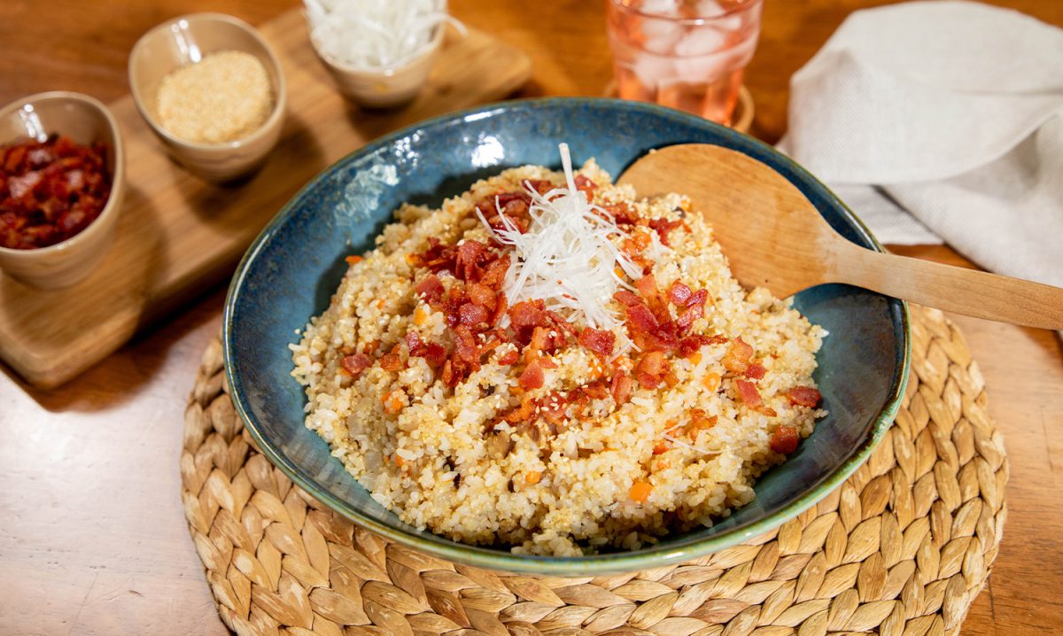 9.ตักใส่จานเสิร์ฟ โรยหน้าเบคอนกรอบ ต้นหอมซอย และงาขาวคั่ว พร้อมรับประทาน