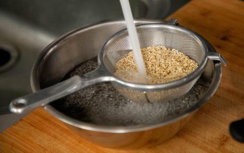 1.ซาวข้าวสารญี่ปุ่นจนน้ำใส ล้างคีนัวผ่านน้ำเพื่อลดรสขม สะเด็ดน้ำรวมกัน พักไว้ประมาณ 10 นาที