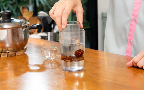 2.แช่เห็ดหอมแห้งในน้ำจนนุ่ม เก็บน้ำแช่เห็ดไว้ 250 มิลลิลิตร จากนั้นหั่นเห็ดเป็นเต๋าเล็ก ๆ