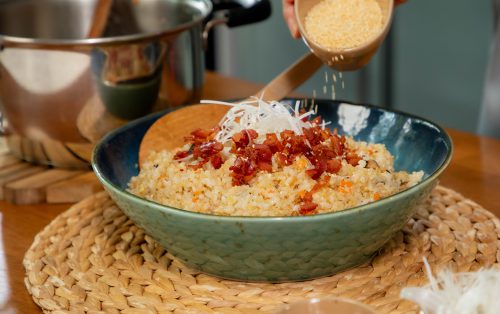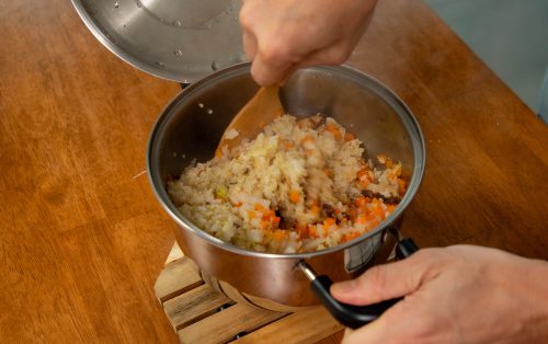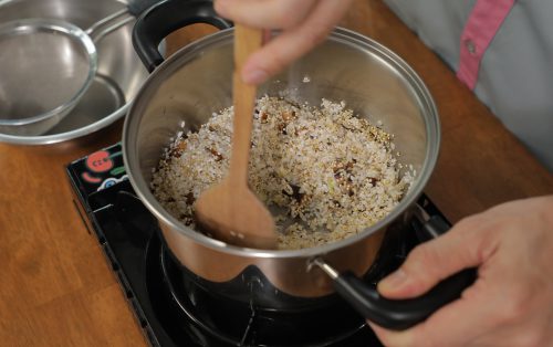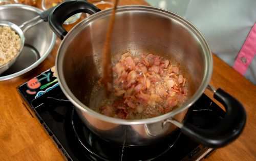 5.ใช้น้ำมันจากการผัดเบคอนประมาณ 2 ช้อนโต๊ะ ผัดแกนกลางต้นหอมและเห็ดหอมจนหอม ใส่ข้าวสารและคีนัวลงไป ผัดให้เมล็ดข้าวเคลือบน้ำมันทั่วดี