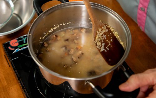 6.เติมน้ำแช่เห็ด และน้ำสะอาดตามสูตร ใส่ผงดาชิ คนพอเข้ากัน เมื่อเริ่มเดือด โรยแครอทและไชเท้าด้านบน ปิดฝา ลดไฟอ่อน หุงประมาณ 15 นาที