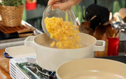1.เตรียมภาชนะที่สามารถเข้าเตาอบได้ ตั้งน้ำสำหรับต้มเส้น ใส่เกลือ ต้มเส้นชิฟเฟอรี ประมาณ 6 นาที (น้อยกว่าระดับ al dente 1 นาที)