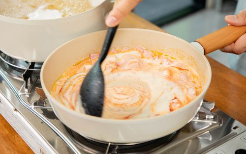 2.ตั้งกระทะไฟกลาง ใส่เนยลงไป ผัดแฮมจนหอมและเริ่มมีสีเล็กน้อย ใส่มะเขือเทศเข้มข้น ผัดให้คลายตัวและมีกลิ่นหอม เติมน้ำต้มเส้น และวิปครีมลงไป คนให้เข้ากัน จากนั้นใส่ซอสคาร์โบนาร่ากลิ่นทรัฟเฟิล คนให้ซอสเนียนเข้ากันดี