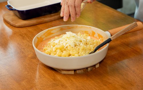 3.ใส่เส้นพาสต้าลงไป ยกออกจากความร้อน คลุกให้ซอสเคลือบทั่ว ใส่ชีสมอซซาเรลล่าส่วนแรก คนให้กระจายดี ตักใส่ภาชนะอบ