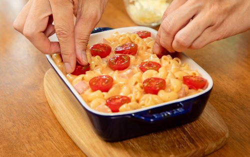 4.หั่นครึ่งมะเขือเทศเชอร์รี่ วางด้านที่ตัดขึ้นด้านบน กดเบา ๆ ให้จมเล็กน้อยในซอส