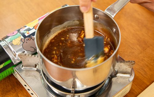 1.ทำซอสบัตเตอร์สก็อต โดยนำวิปครีม น้ำตาลทรายแดง วานิลลา และเนยจืด ใส่หม้อตั้งไฟ เคี่ยวด้วยไฟกลาง จนซอสข้นดี พักให้เย็นสนิท