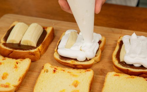 2.ทาซอสบัตเตอร์สก็อตลงบนขนมปัง ผ่าครึ่งกล้วยหอมวางคว่ำลงไป บีบวิปปิ้งครีมลงไปกล้วยหอม ประกอบด้วยขนมปังอีกแผ่น ห่อด้วยฟิล์มถนอมอาหาร แช่เย็น 1 ชั่วโมง หั่นครึ่ง พร้อมรับประทาน