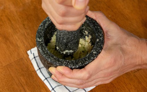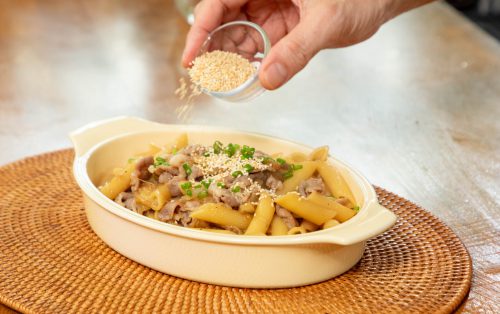 1.โขลกงาขาวให้แหลก ตามด้วยกระเทียมและแอปเปิล พอละเอียดดี ปรุงรสด้วยโชยุ มิริน น้ำตาลทราย น้ำมันงา และพริกไทยดำ หมักกับหมูสไลด์เป็นเวลา 10–15 นาที