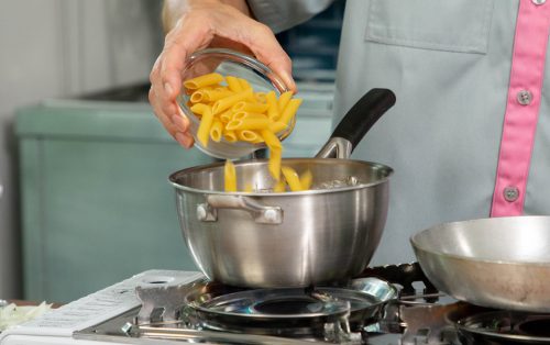 2.ตั้งน้ำใส่เกลือ ต้มเส้นเพนเน่ให้ได้ระดับ al dente สะเด็ดน้ำ และเก็บน้ำต้มเส้นไว้เล็กน้อย