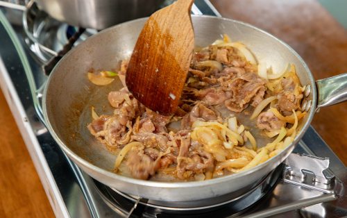 3.ตั้งกระทะให้ร้อน ใส่เนยจืด ผัดหอมใหญ่จนสุกใส ใส่หมูบูลโกกิลงไป ผัดด้วยไฟกลางจนหมูสุกนุ่มและซอสเคลือบทั่ว