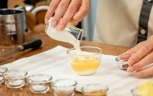 1.ผสมไข่ไก่ วิปปิ้งครีม และวานิลลา คนให้เข้ากันดี พักไว้
