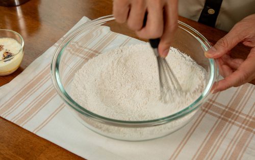 2.ใส่แป้งสาลี ผงฟู เบกกิ้งโซดา และเกลือ ลงในชามผสม เติมน้ำตาลทราย และน้ำตาลทรายแดง คนให้เข้ากัน