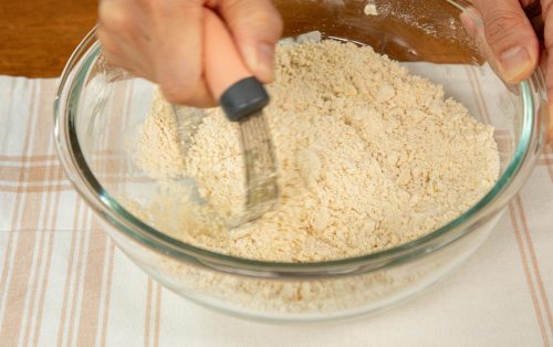 3.ใส่เนยเย็นที่หั่นเต๋าลงไป ใช้ที่สับแป้งตัดให้ส่วนผสมมีลักษณะเป็นเม็ดร่วนคล้ายทรายหยาบ