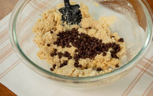 4.เทส่วนผสมของเหลวลงไป ใช้พายยางตะล่อมให้พอเข้ากัน ใส่ช็อกโกแลตชิพ คลุกให้กระจายทั่ว โดยไม่ต้องนวดมาก