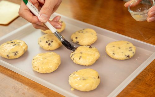 5.แบ่งโดก้อนละ 60 กรัม ปั้นเป็นก้อนกลม กดให้แบนเล็กน้อย ทาหน้าด้วยไข่บาง ๆ แล้วนำเข้าแช่เย็น 15 นาที