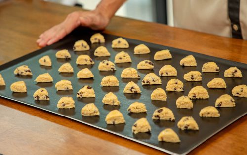 7.นำโดออกจากตู้เย็น ทาไข่อีกครั้ง แล้วตัดแต่ละก้อนเป็น 6 ชิ้น จัดเรียงลงบนถาดอบ