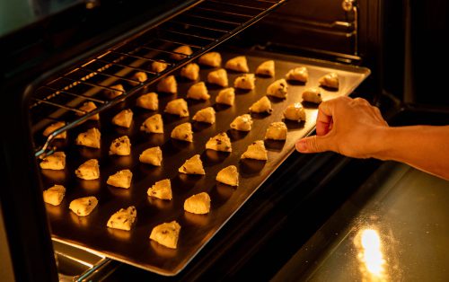9.(สำหรับเพิ่มความกรอบและยืดอายุการเก็บ) พักคุกกี้ให้เย็นลง แล้วนำเข้าอบต่อที่อุณหภูมิ 100 องศาเซลเซียส ประมาณ 20 นาที เพื่อไล่ความชื้น พักให้เย็นสนิทก่อนเก็บในภาชนะปิดสนิทหรือกล่องสูญญากาศ