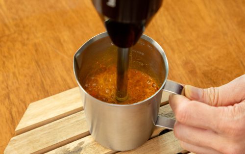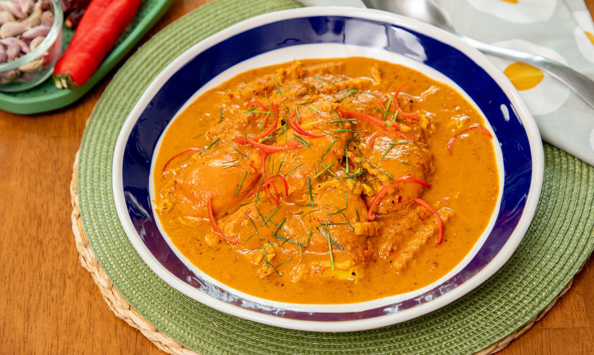 1.ล้างพริกแห้งทั้งสองชนิดผ่านน้ำ ผ่าและเคาะเม็ดออก ใส่ลงในถ้วยปั่น พร้อมเกลือ ตะไคร้ ขมิ้น กระเทียมไทย หอมแดง เม็ดพริกไทยดำ กะปิ ขมิ้นผง น้ำปลา และน้ำตาลปี๊บ เติมน้ำร้อน พักไว้ประมาณ 2 นาที จากนั้นปั่นให้เนียนละเอียด
