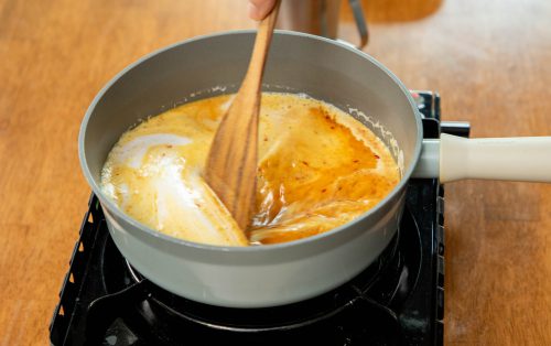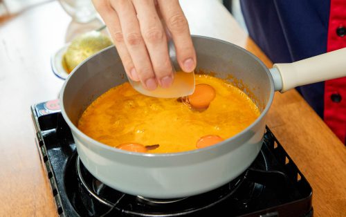 3.ตักยอดมะพร้าวออกพักไว้ ตอกไข่เป็ดใส่ลงไปทีละฟอง ต้มด้วยไฟอ่อนจนไข่ขาวเซตตัวตามต้องการ ใส่ยอดมะพร้าวกลับลงไป ตามด้วยใบมะกรูดซอย คนเบา ๆ