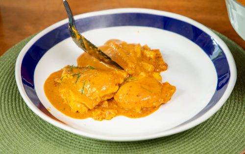 4.ตักใส่จานเสิร์ฟ โรยพริกชี้ฟ้าซอย และใบมะกรูดซอยอีกเล็กน้อย พร้อมเสิร์ฟร้อน ๆ