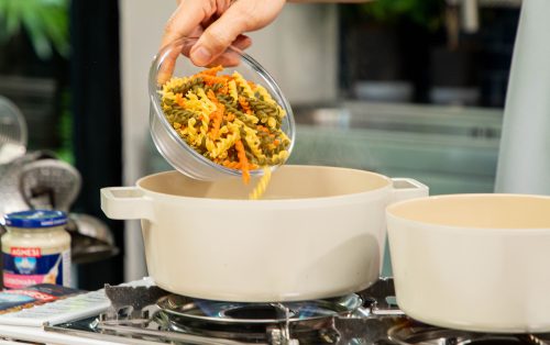 1.ตั้งน้ำสำหรับต้มเส้น ใส่เกลือ ต้มเส้นเอลิเก้ให้ได้ระดับ al dente