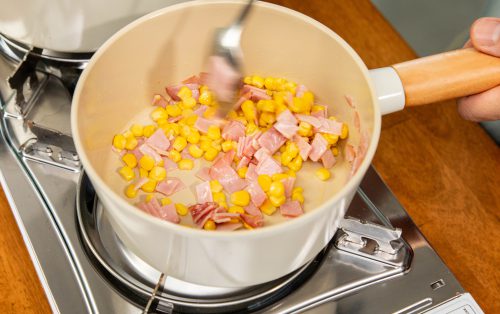 2.ผัดข้าวโพด กับแฮม กับเนย จนสุกหอม พักไว้