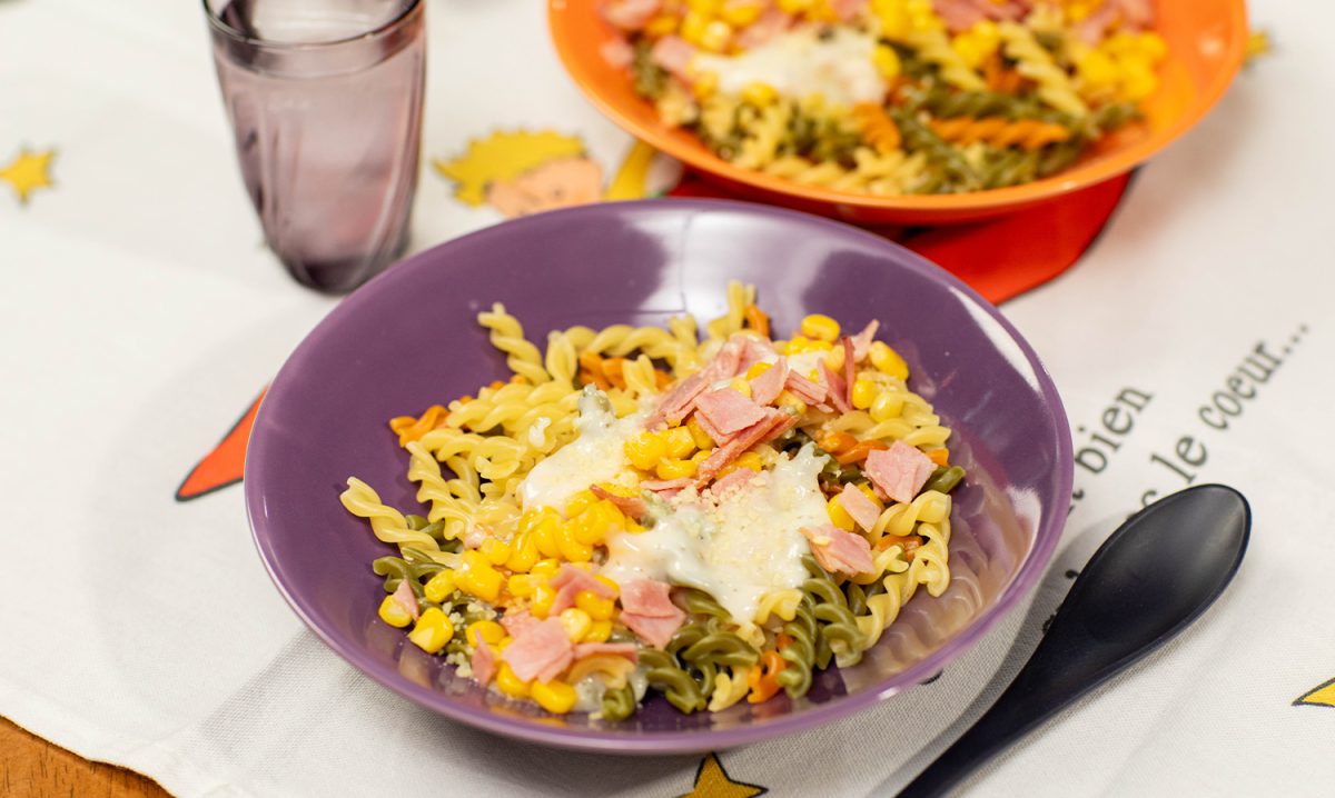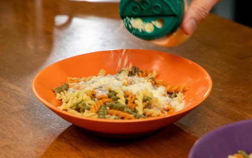 4.ตักเส้นใส่จานเสิร์ฟ ราดซอส โรยพาร์มิซาน ตักข้าวผัดและแฮมผัดเนยตามลงไป พร้อมรับประทาน