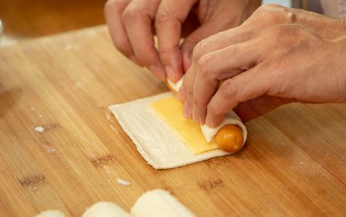 2.รีดขนมปังตัดขอบให้แบนลง วางชีสเชดด้าลงตรงกลาง ตามด้วยไส้กรอก ทาน้ำแป้งที่ขอบขนมปัง ม้วนปิดให้เรียบร้อย ทำซ้ำจนครบ