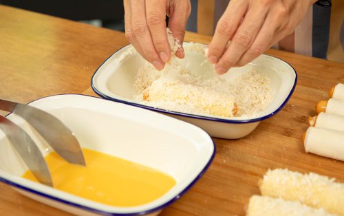 3.ตอกไข่ใส่ชาม ตีให้เข้ากัน นำขนมปังที่ม้วนแล้วชุบไข่ให้ทั่ว จากนั้นคลุกเกล็ดขนมปังให้เคลือบทั่วทั้งชิ้น