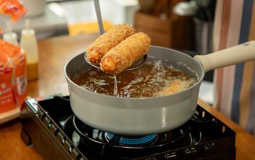 4.ตั้งน้ำมันที่อุณหภูมิประมาณ 170 องศาเซลเซียส นำลงทอดจนเกล็ดขนมปังมีสีเหลืองทองและกรอบทั่วทั้งชิ้น ตักขึ้นพักบนตะแกรงให้สะเด็ดน้ำมัน