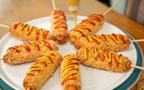5.เสียบไม้ที่ปลายด้านหนึ่งเพื่อให้จับถนัดมือ เสิร์ฟพร้อมซอสมะเขือเทศและมัสตาร์ดตามชอบ