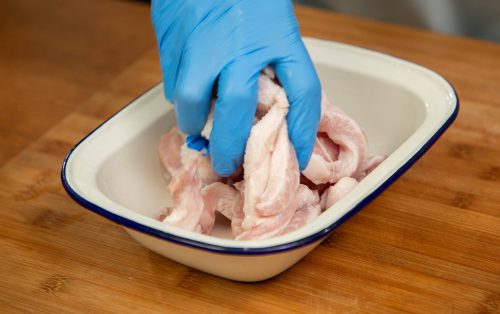 1.หั่นสันคอหมูเป็นเส้นหนาประมาณ 1 เซนติเมตร เคล้ากับน้ำส้มสายชูให้ทั่ว จากนั้นล้างด้วยน้ำสะอาดและซับให้หมูแห้งดี ใส่น้ำปลา นวดให้ซึมเข้าสู่เนื้อหมู พักไว้ประมาณ 10 นาที