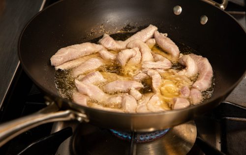 2.ตั้งกระทะใส่น้ำมันให้ได้อุณหภูมิประมาณ 160 องศาเซลเซียส ใส่หมูลงทอด ใช้ไฟกลาง คอยคนเป็นระยะให้สุกทั่วกัน ทอดจนหมูสุกและขึ้นสีสวย ใช้เวลา 8–9 นาที ตักขึ้นและพักให้สะเด็ดน้ำมัน