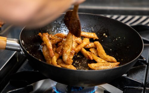 3.โขลกรากผักชี กระเทียม และพริกไทยให้ละเอียด ตั้งกระทะใส่น้ำมันรำข้าว ใช้ไฟอ่อนผัดสามเกลอให้หอม จากนั้นเติมน้ำปลา ซอสหอยนางรม น้ำตาลปี๊บ และน้ำสะอาด เคี่ยวจนซอสข้นเล็กน้อย ใส่หมูทอดลงคลุกให้ซอสเคลือบทั่ว ปิดไฟและพักไว้