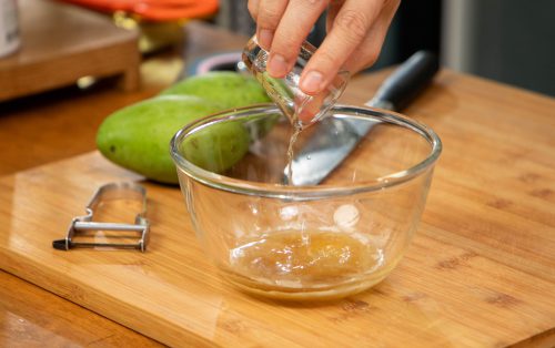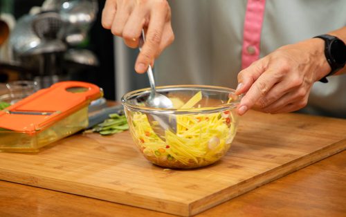 5.ใส่มะม่วงซอย หอมแดง และพริกจินดาลงในชาม คลุกกับน้ำยำให้เข้ากันดี โรยผักชี เคล้าเบา ๆ แล้วจัดใส่จาน