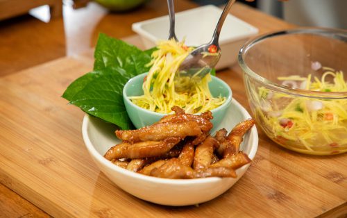 6.วางคอหมูทอดน้ำปลาเคียงกับยำมะม่วง รับประทานคู่กัน