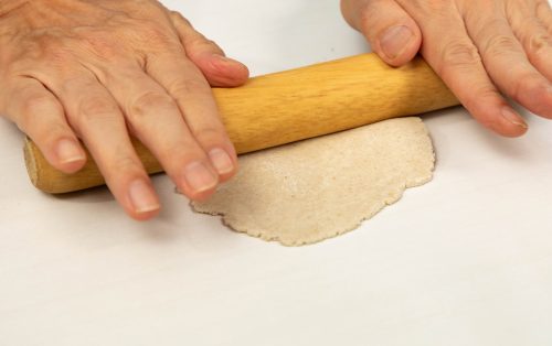 2.รีดแป้งแต่ละก้อนให้บางสม่ำเสมอ พยายามให้เป็นทรงกลม ก่อนใช้คัตเตอร์วงกลมขนาด 5.5 นิ้ว ตัดให้ได้แผ่นสวยงาม คลุมด้วยผ้า หรือพลาสติกแรปเพื่อกันแป้งแห้ง