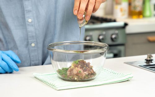 3.เตรียมไส้ไก่ขิงสด ผสมอกไก่บด กระเทียม ขิง ต้นหอม เห็ดหูหนู โชยุ น้ำตาล น้ำมันงา น้ำมันรำข้าว พริกไทย และแป้งข้าวโพด นวดให้ส่วนผสมเข้ากันดีจนเหนียวเล็กน้อย