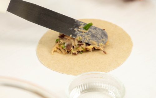 4.ห่อเกี๊ยว โดยตักไส้ประมาณ 40 กรัม วางตรงกลางแผ่นเกี๊ยว ใช้น้ำแตะขอบแป้ง พับครึ่งแล้วจีบให้สวยงาม ทำซ้ำจนได้ 5 ชิ้น
