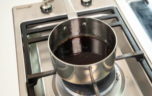 5.ทำน้ำจิ้ม ผสมโชยุ น้ำส้มสายชูข้าว น้ำตาล และดาชิในหม้อเล็ก ตั้งไฟอ่อนให้น้ำตาลละลาย ยกลง พักให้เย็น แล้วเติมน้ำมันงา คนให้เข้ากัน