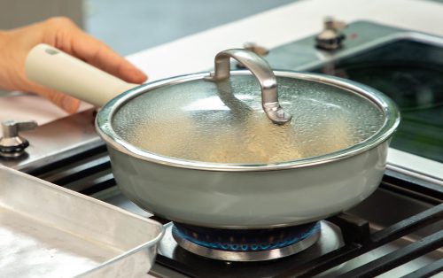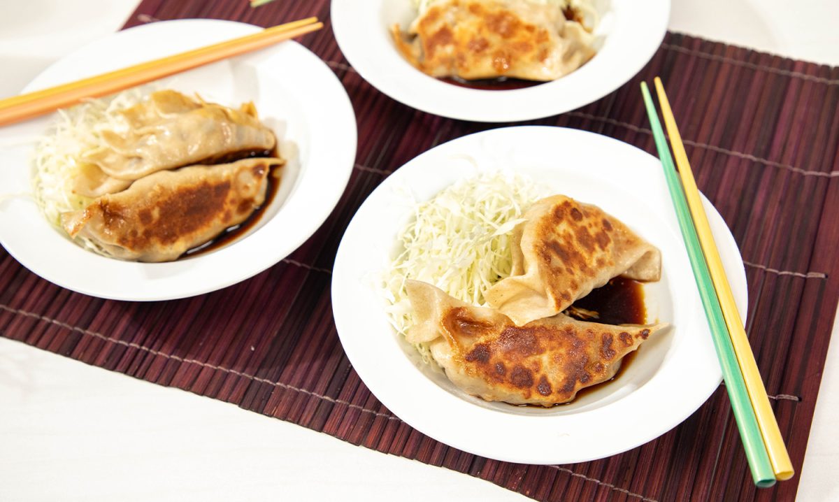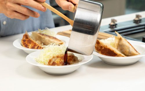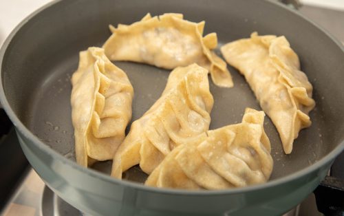 6.ขั้นตอนจี่และนึ่งเกี๊ยวซ่า เริ่มจากตั้งกระทะใส่น้ำมันรำข้าวบาง ๆ ให้เคลือบพื้นกระทะ วางเกี๊ยวซ่าลงจี่จนผิวด้านล่างเริ่มขึ้นสีอ่อน เติมน้ำเล็กน้อย (พอท่วมแบบบาง ๆ) แล้วปิดฝา ปล่อยให้ไอน้ำอบจนเกี๊ยวสุก ประมาณ 5–6 นาที