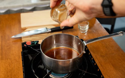 3.ผสมน้ำมะขามเปียก น้ำปลา และน้ำตาลทรายแดงในหม้อเล็ก ตั้งไฟอ่อนคนจนละลายดี ยกลงพักให้คลายร้อน เติมซอสปรุงรส น้ำมะนาว พริกป่น และข้าวคั่ว คนให้เข้ากัน จากนั้นใส่ต้นหอมและผักชีฝรั่งซอย