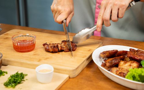 4.จัดสะโพกไก่ย่างลงจาน เสิร์ฟคู่กับน้ำจิ้มแจ่ว และน้ำจิ้มไก่ตามชอบ จะเสิร์ฟพร้อมผักสดหรือข้าวเหนียวเพื่อให้ครบเครื่องก็ได้