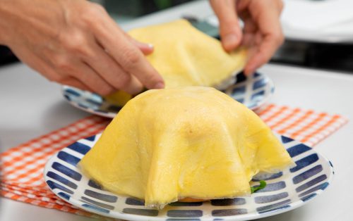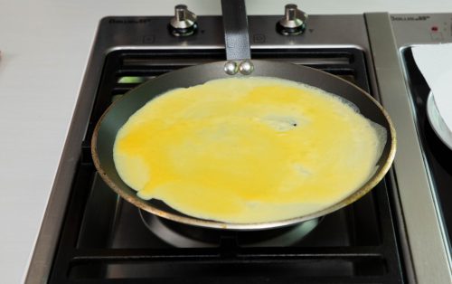 1.ตีไข่ไก่กับนมและเกลือ กรองให้เนียน แบ่งเป็นสองส่วน ตั้งกระทะ non-stick ใช้ไฟอ่อน เทส่วนผสมไข่ลงไป กรอกให้ทั่ว พอเริ่มเซตตัวกลับด้านให้สุกดี พักไว้คลุมด้วยผ้า ทำซ้ำอีกแผ่น