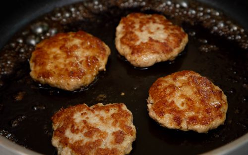 4.Heat vegetable oil in a pan. Sear the pork patties on both sides until cooked through, then pour in the teriyaki sauce. Simmer until the patties are evenly glazed. Remove and set aside.