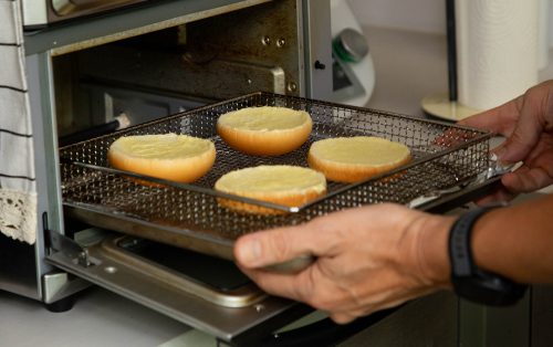 5.ทาเนยบาง ๆ บนขนมปังเบอร์เกอร์ นำเข้าอบให้พอกรอบและหอม