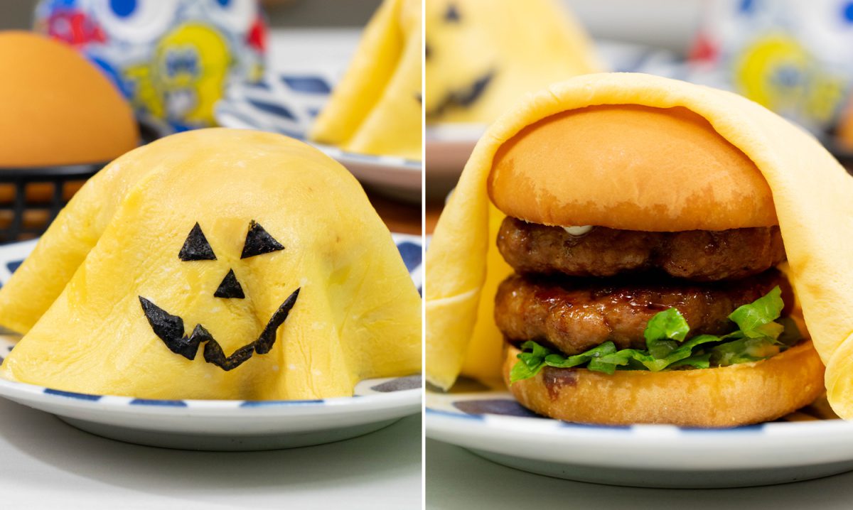 เบอร์เกอร์หมูเทริยากิสไตล์ญี่ปุ่น หวานเค็ม หอมมันด้วยมายองเนส ซ่อนอยู่ใต้แผ่นไข่เนียนบางที่ตกแต่งเป็นลายตา จมูก ปากด้วยสาหร่ายญี่ปุ่น เพื่อให้เป็นเมนูเบอร์เกอร์แสนอร่อยในบรรยากาศฮาโลวีน