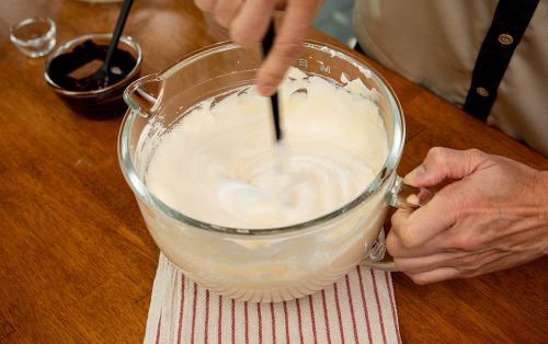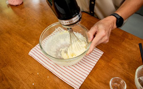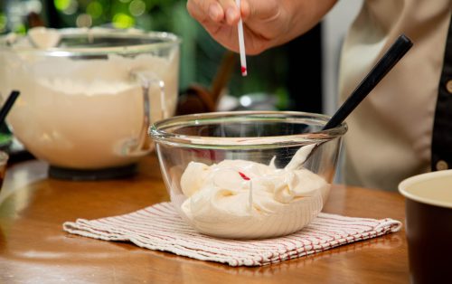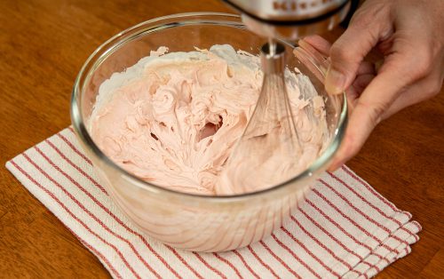 9.ตีมัสคาร์โปนกับน้ำตาลไอซิ่ง แยมราสป์เบอร์รี่ และกลิ่นลิ้นจี่ จนส่วนผสมเนียนเข้ากันดี แต่งสีแดงเล็กน้อย ใส่วิปครีมลงไป ตีต่อจนเนื้อครีมข้นแน่นขึ้น แต่ยังคงมีความเนียนและบีบขึ้นรูปได้ นำใส่ถุงบีบ เตรียมไว้