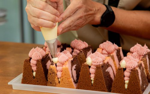 8.นำเค้กออกจากเตาอบ คว่ำพิมพ์พักในลักษณะตีลังกาเพื่อป้องกันการยุบตัว พักให้เย็นสนิทก่อนแซะออกจากพิมพ์ ตัดแบ่งเป็น 8 ชิ้น จากนั้นนำด้านโค้งของตัวเค้กวางเป็นฐาน ผ่าตรงกลางชิ้นเค้กให้ลึกประมาณ ¾ ของความหนา เพื่อใช้สำหรับบีบไส้ลงไป โดยระวังไม่ให้ชิ้นเค้กขาด