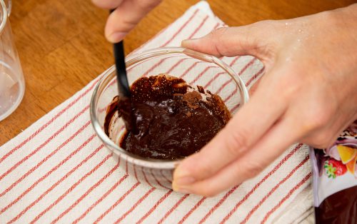 2.ละลายผงโกโก้กับนมสดอุ่นในชามผสม คนให้เนียน พักไว้
